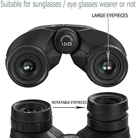 - ADJUSTABLE EYE CUPS FIT EYEGLASS WEARERS OR NO. The binocs can be pull down the rubber eyepieces and more fit the glasses wearer, getting close to lens and see easily. The long eye relief combined with large eyepiece give you a comfortable viewing while wearing sunglasses or eye glasses. For those who do not wear glasses, will gain more focused slight and feel more easeful through rising eye cups. The compact binoculars has 15mm large eyepieces, can see more clear image than other travel binoculars.